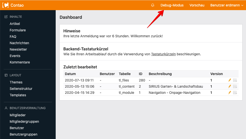 - Über den Contao Manager innerhalb der Systemwartung den Debug-Modus aktivieren